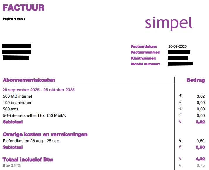 Mijn abonnement is opgezegd met einddatum 25-09-2025 (bevestiging aanwezig). Toch heb ik op 26-09-2025 een factuur ontvangen met abonnementskosten voor 26-09-2025 t/m 25-10-2025, plus plafondkosten 26 aug – 25 sep €0,50; totaal €4,32 incl. btw (btw €0,75).