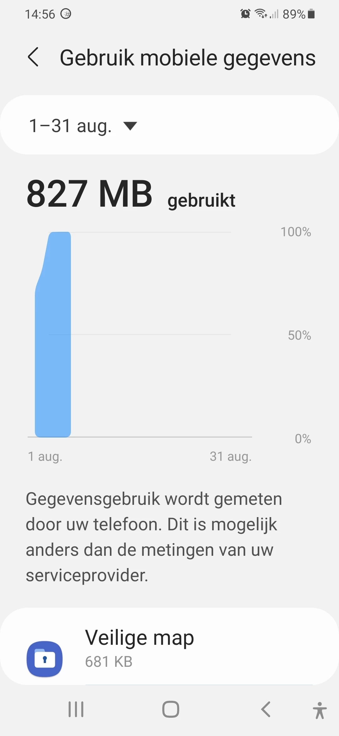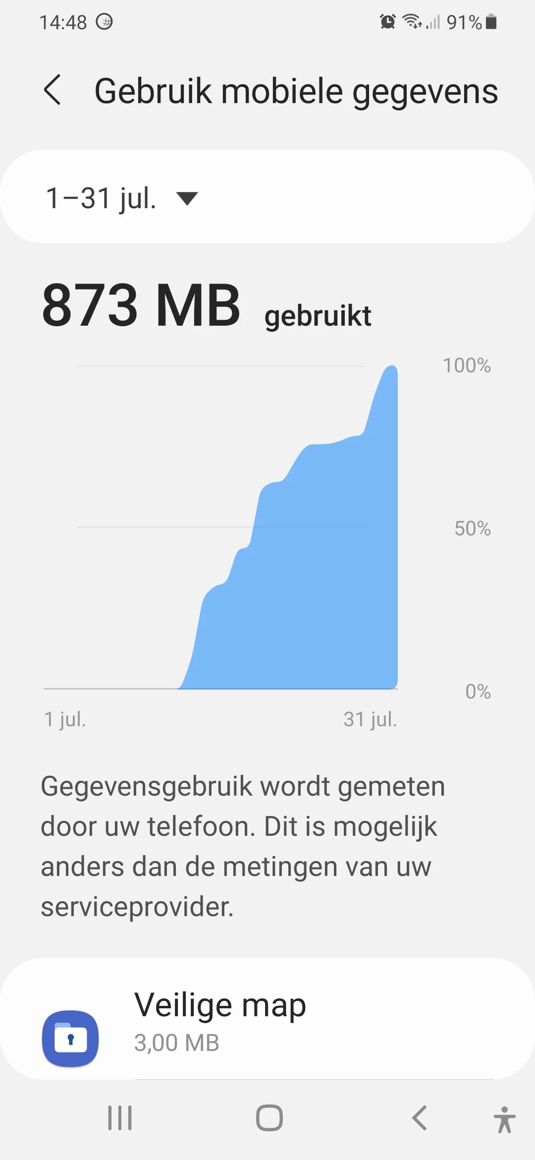 Mijn telefoon registreert in de periode juli slechts 873 MB aan mobiel dataverbruik, terwijl de Simpel-app aangeeft dat ik in dezelfde periode (vanaf 14 juli) 1619 MB verbruikt zou hebben.