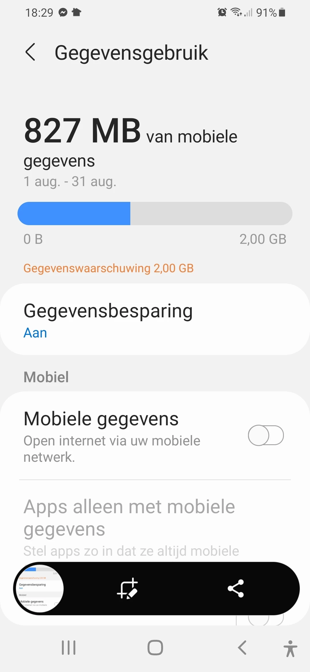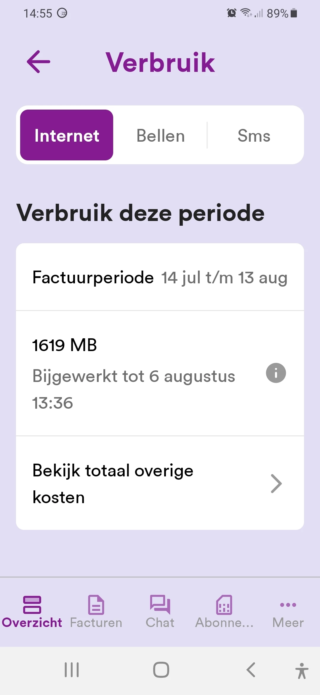 Op 6 augustus heb ik beide instellingen opnieuw gecontroleerd: mobiele data stond nog steeds uit, en het automatisch overschakelen bij slechte wifi was nog steeds uitgeschakeld. Mijn telefoon heeft die avond binnenshuis op de wifi gelegen en is niet verplaatst. Toch geeft de Simpel-app aan dat er in de periode tussen 18.00 en 00.00 uur 7 kB aan mobiele data verbruikt zou zijn. Ik weet 200% zeker dat dit onjuist is.